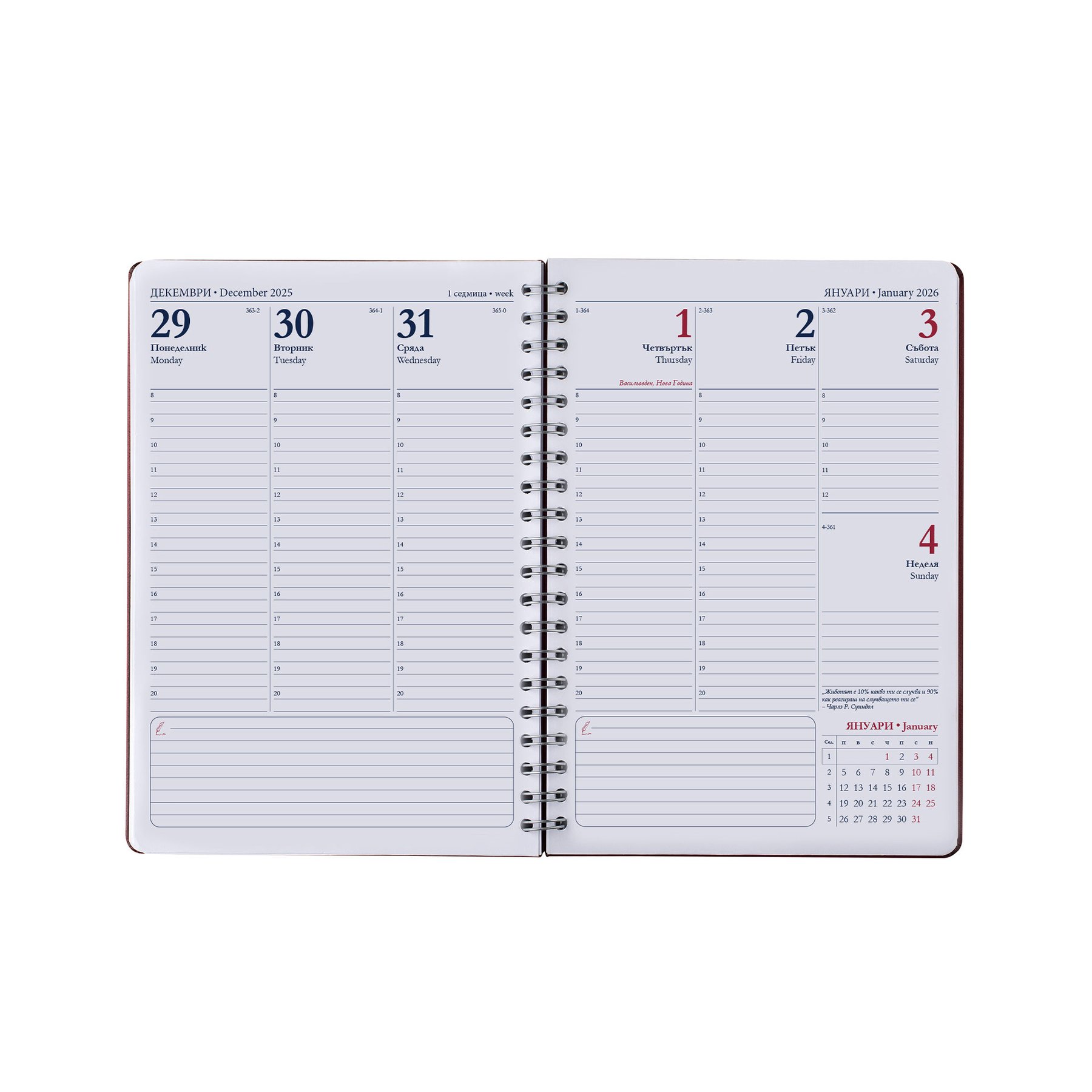 Размери: 19 х 27 cm; Твърда корица облечена в термо кожа; Тяло: 144 страници; Година отпечатана на сребърен фон; 16 страници полезна информация; Закръглени ъгли; Черни форзаци; На един разтвор е раположена календарна седмица на месец; Подходящ за сухо преге. Приложима технология на брандиране: преге.
