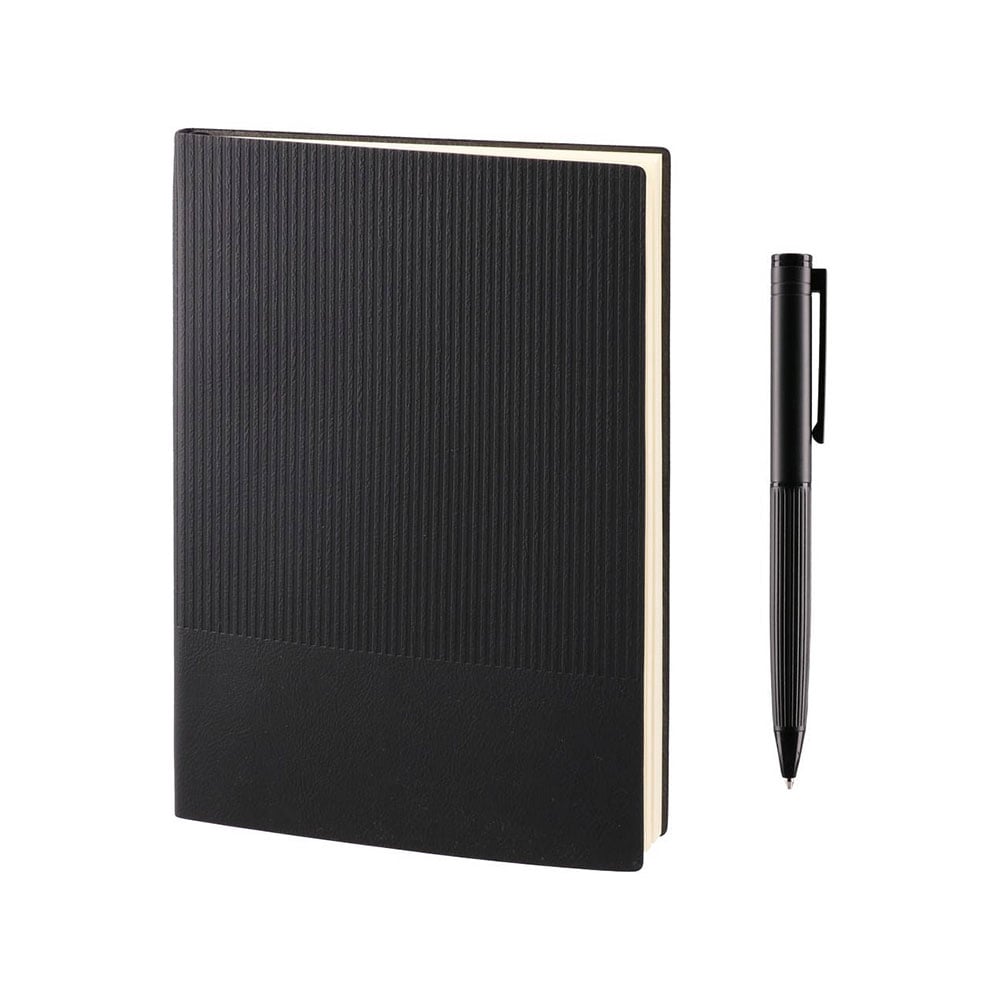 Подаръчен комплект с тефтер A5 и метална химикалка, представен в луксозна кутия. Тефтерът е с мека полиуретанова корица с приятна на допир повърхност и съдържа 100 страници на редове с хартия 80 g. Комплектът е подходящ за бизнес подарък или ежедневна употреба в офис среда.