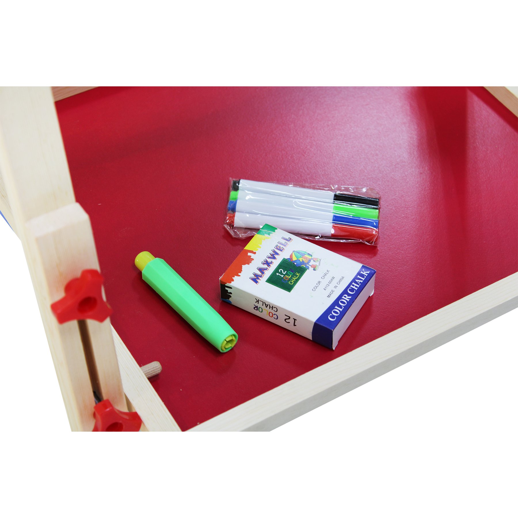 Дъската е в комплект с 12 тебешира в различни цветове; 4 борд маркера и гъба за изтриване.
