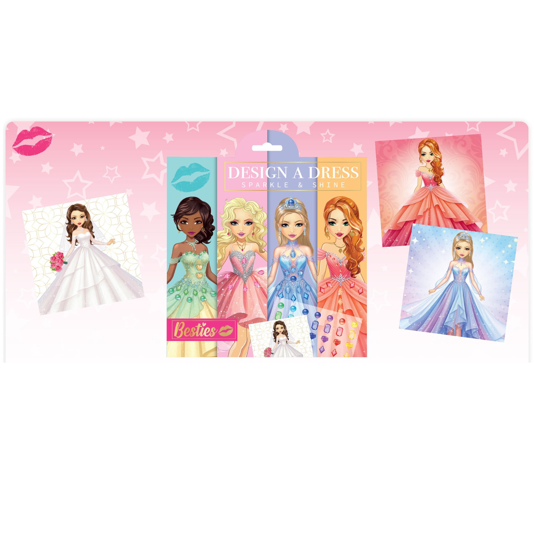 С този творчески комплект всяко дете може да създаде своя собствена блестяща приказна рокля! Комплектът включва 5 красиви картончета с принцеси и декоративни камъчета, с които малките дизайнери могат да украсяват и персонализират роклите им. Подходящ за творчество, игра и развитие на фантазията.Размер на картите: 21.5 х 21.5 cm.