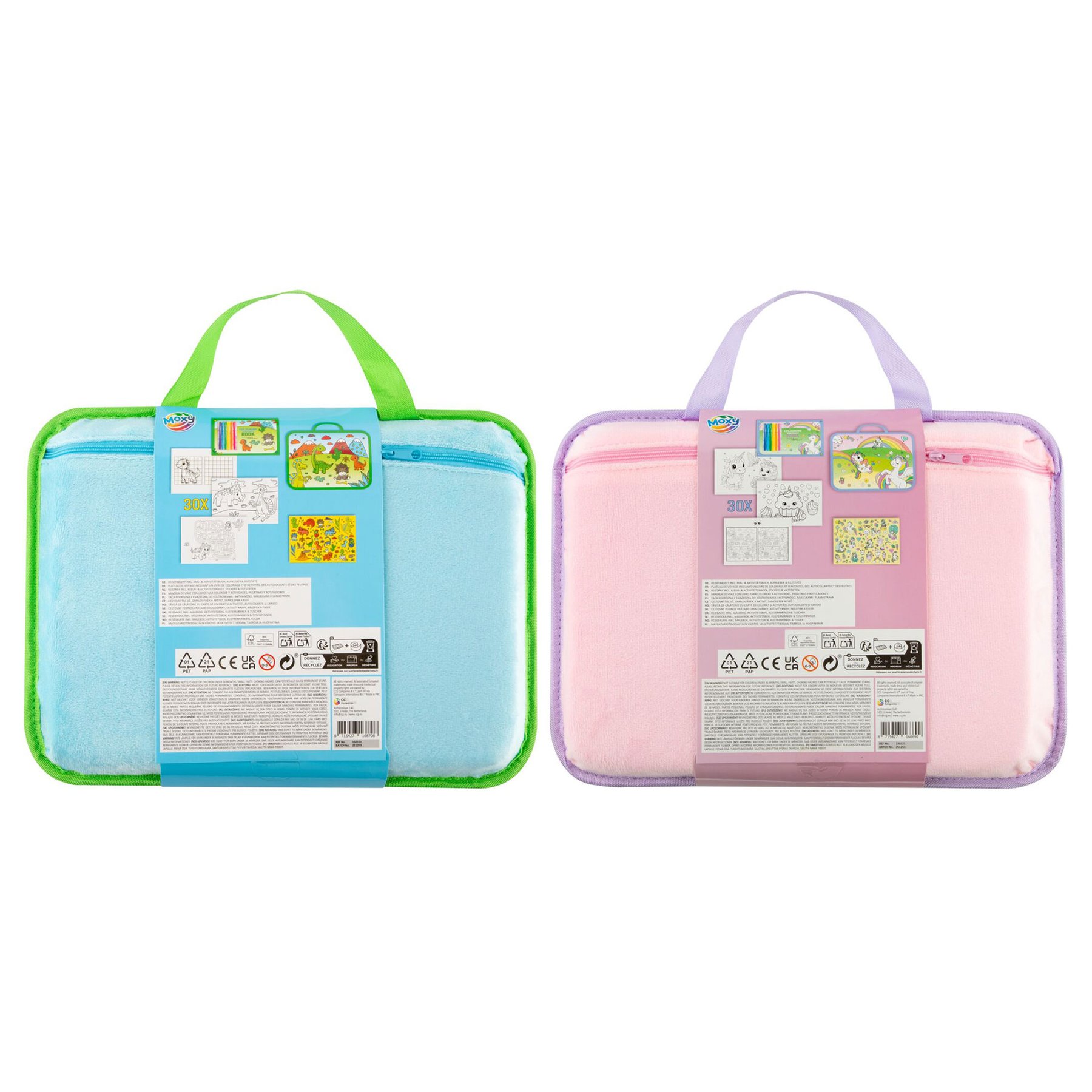 Творчески комплект, създаден специално за забавление в движение! Удобният куфар-папка събира в себе си книжка за оцветяване и игри, цветни стикери и 6 флумастера – всичко необходимо за дълги пътувания, почивки или моменти у дома.