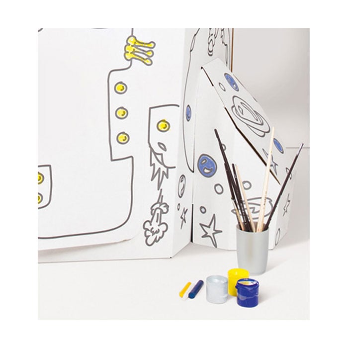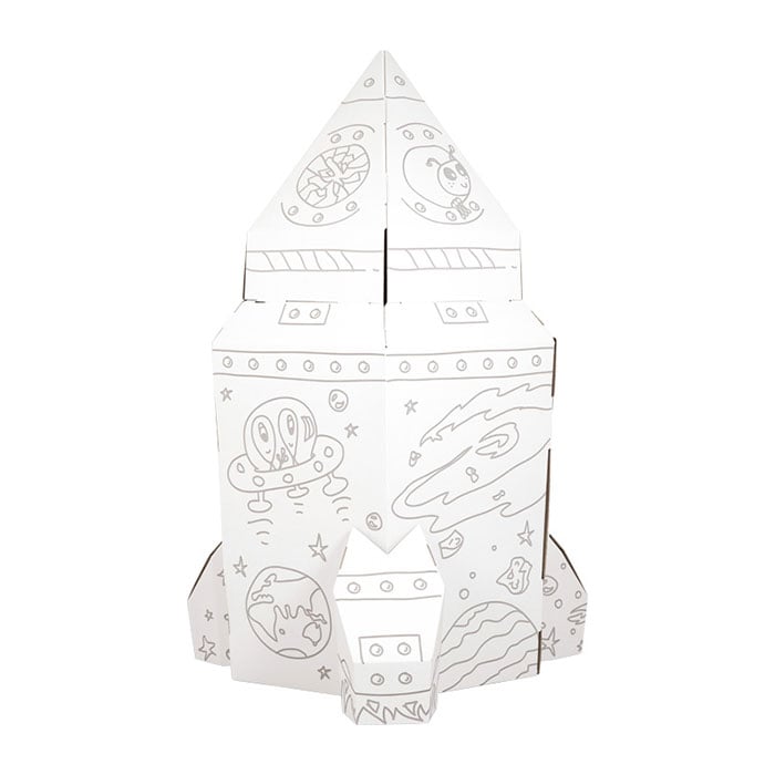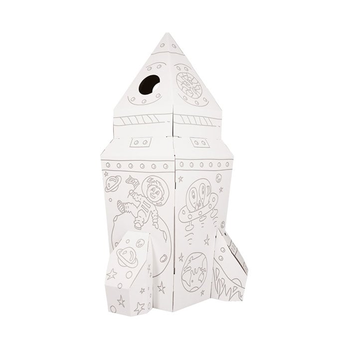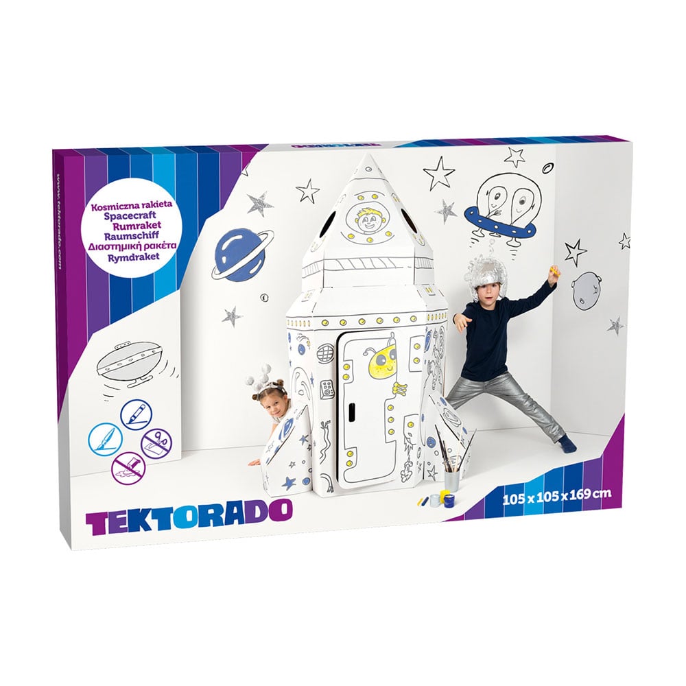 Пътуване до луната или поне пътуване през детската стая обещава тази страхотна къща за игра във формата на ракета. Люковете са перфорирани и могат да бъдат лесно продупчени. Отворът към пилотската кабина може да се отвори.