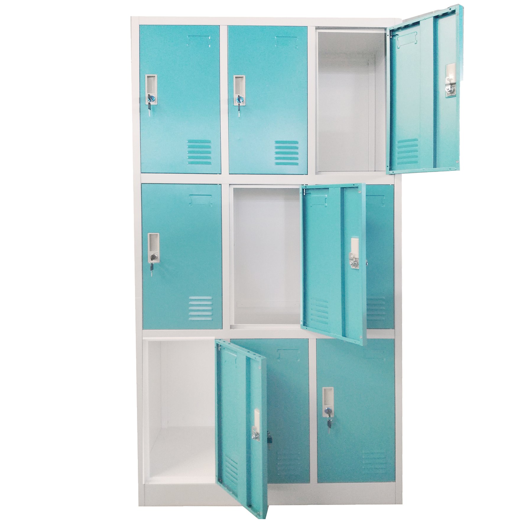 Метален гардероб с 9 метални врати. Има възможност за заключване – уникално за всяка врата. Гардероба има вентилационен отвор.